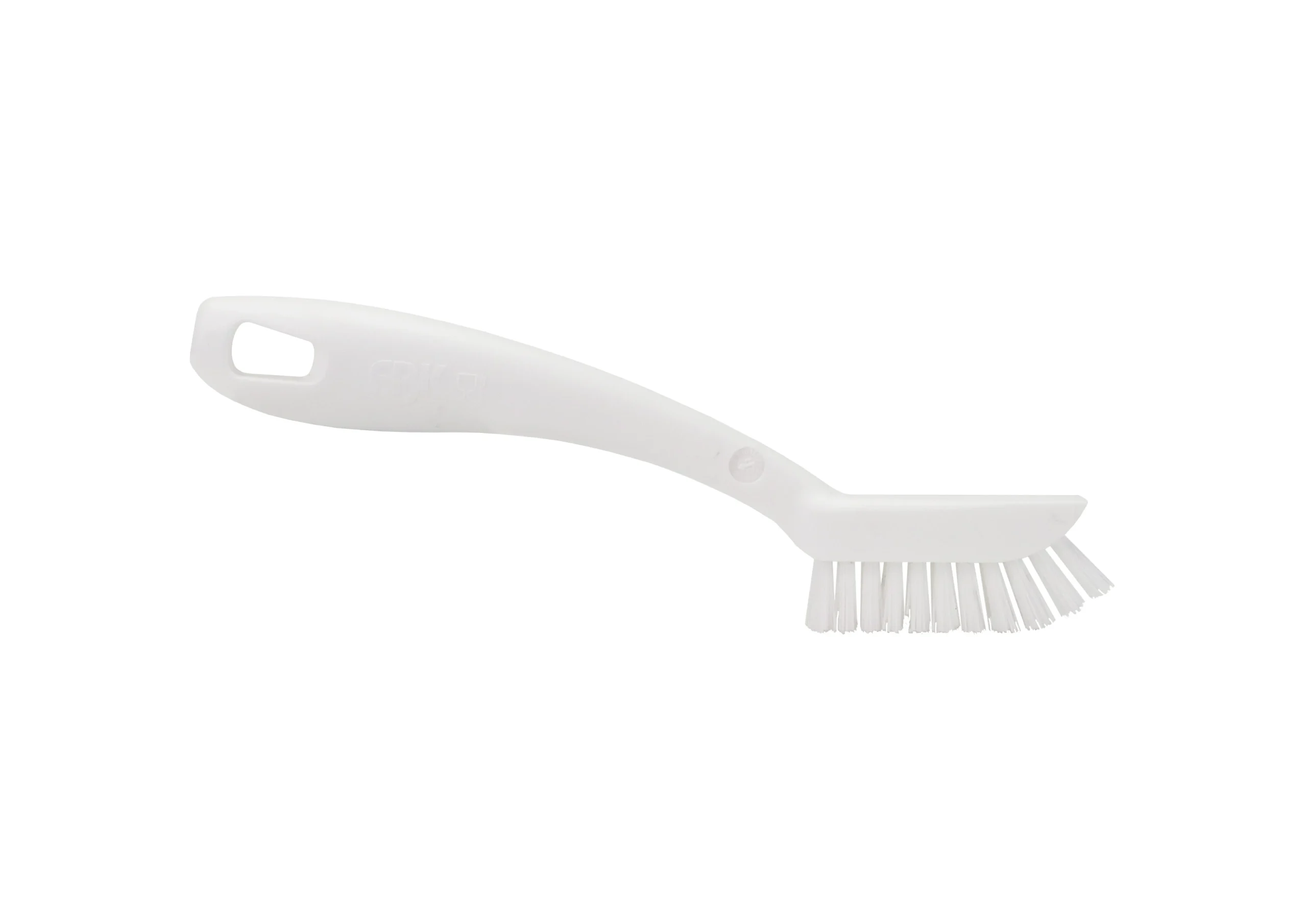 Cepillo de mano para limpieza de maquinaria, con cerdas duras de PBT 0.50 y mango de polipropileno. Tamaño compacto, rigidez y maniobrabilidad especializada en la limpieza de residuos difíciles en todo tipo de espacios técnicos sin comprometer durabilidad. Uso recomendado hasta 80 °C. Esterilizable a 134 °C.