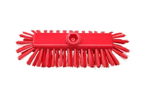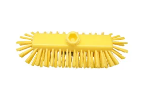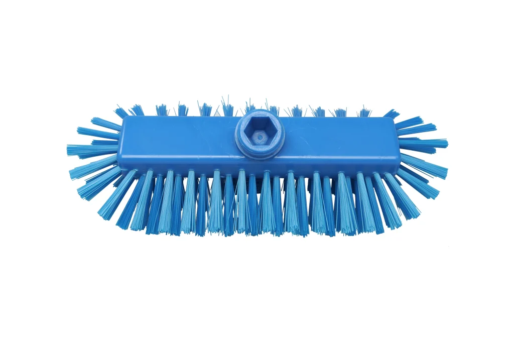 Cepillo de 285 x 120 mm con cerdas PBT de 0.50 mm, rígidas y de excelente durabilidad. El diseño incluye filamentos laterales que permiten una limpieza eficaz en esquinas, bordes y zonas complejas. Soporta temperaturas de hasta 80 °C en uso y 134 °C para procesos de esterilización. Compatible con mangos de rosca externa sin paso de agua.