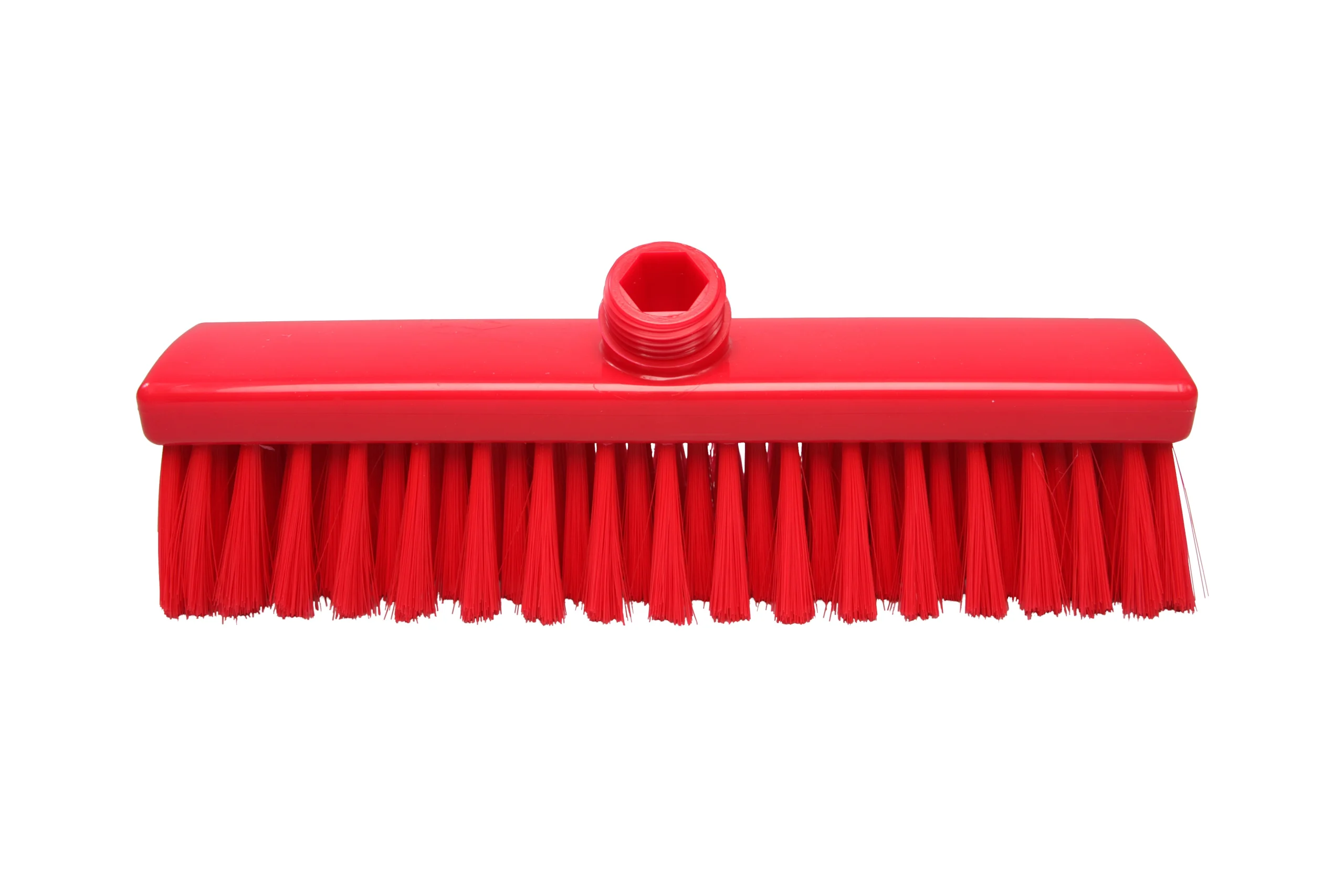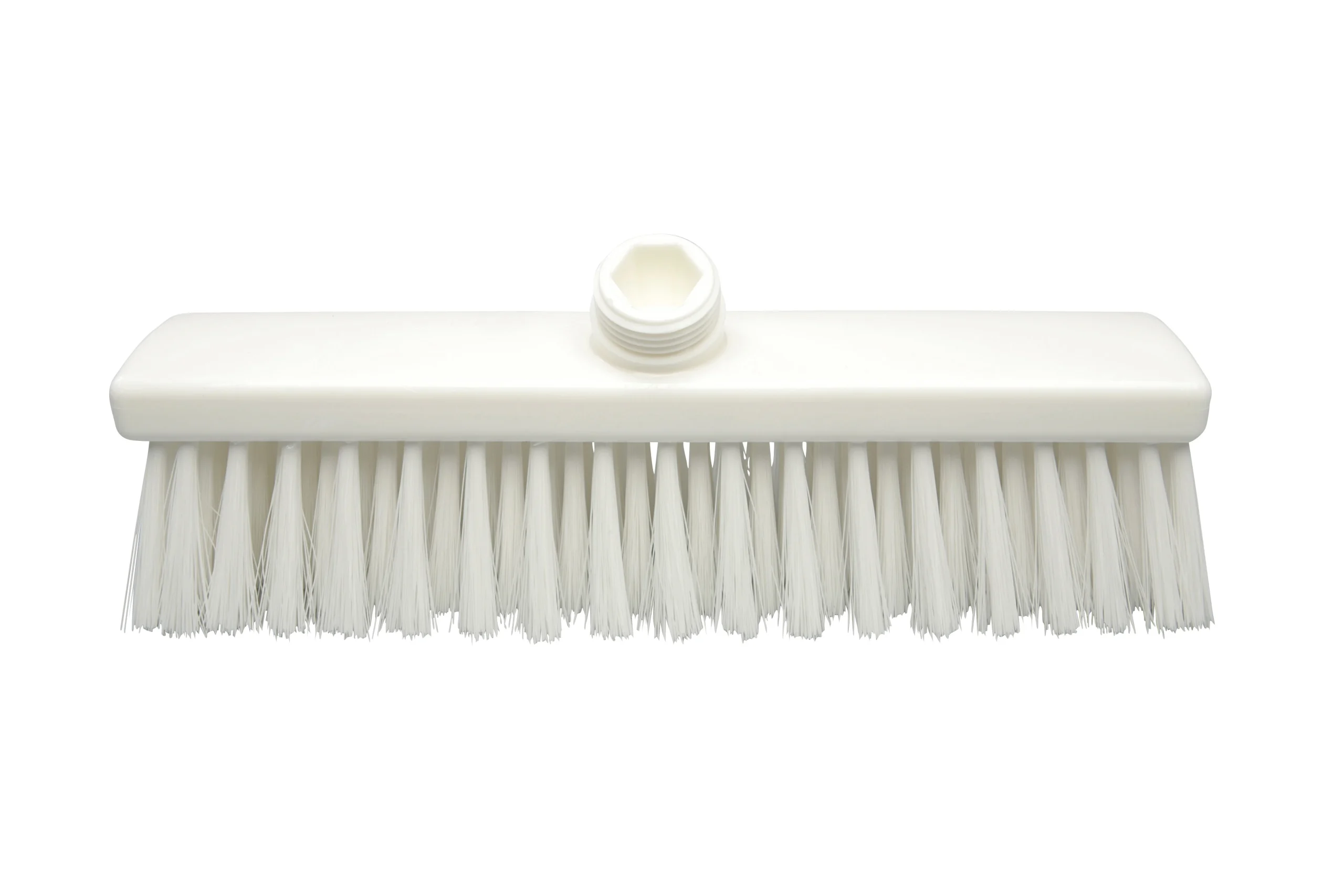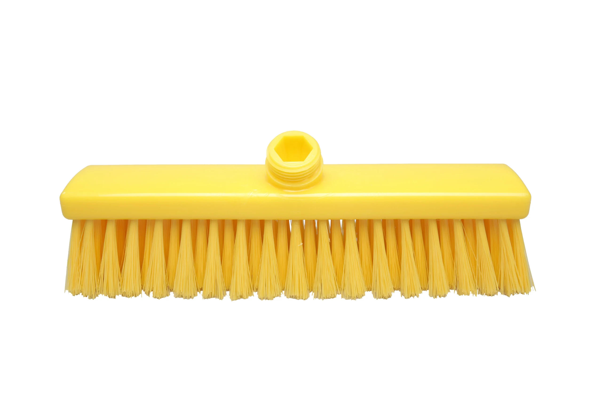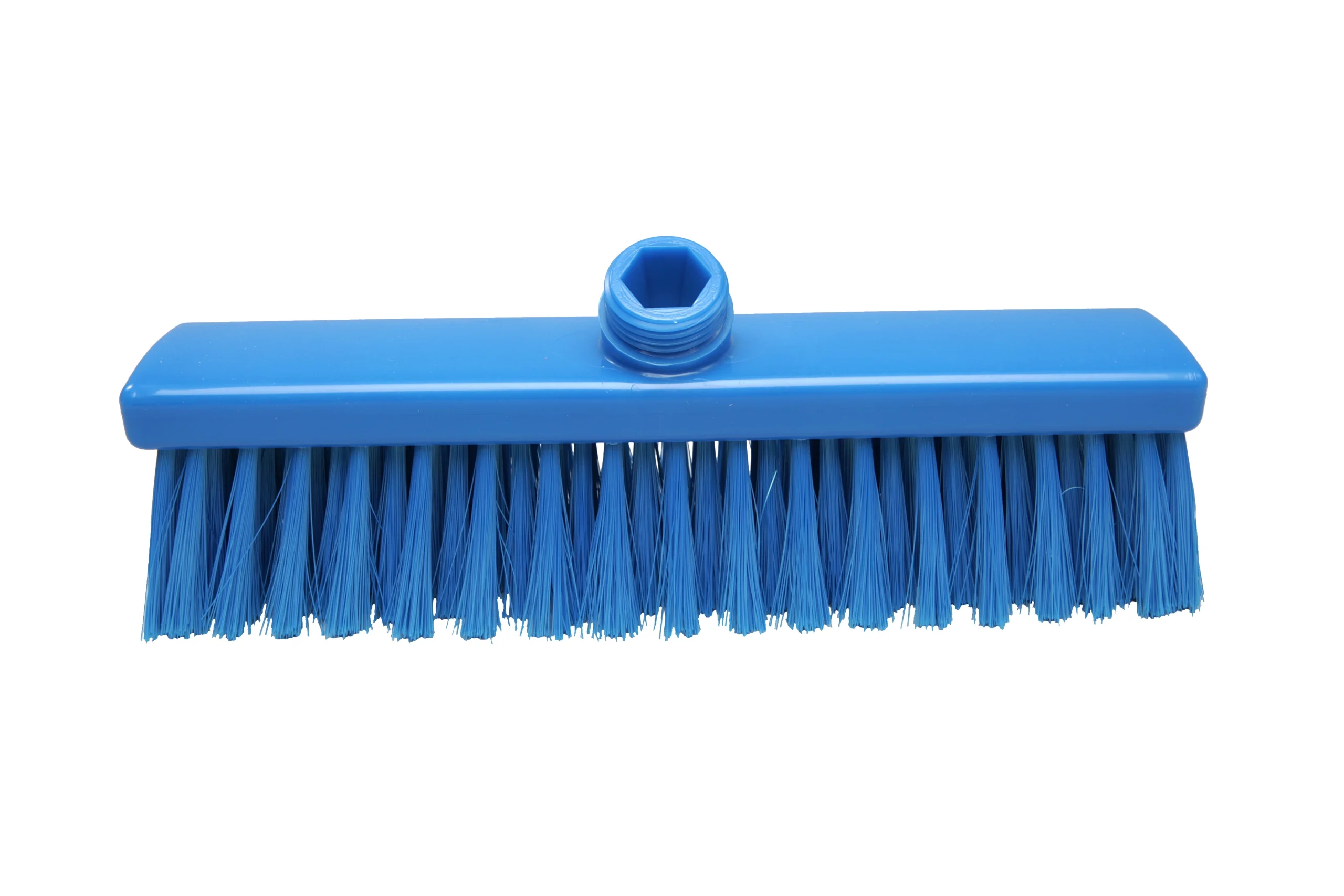 Escoba fabricada en polipropileno resistente, con filamentos de poliéster PBT de 0.30 mm y 55 mm de largo, seleccionados para un cepillado suave ideal para la mayoría de aplicaciones de limpieza ligera en suelos. Compatible con mangos de rosca externa estándar.