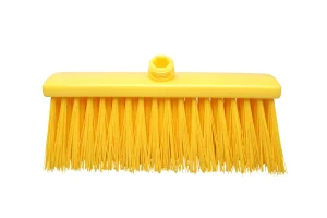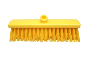 Escoba compacta con filamentos rígidos extralargos, ideal para áreas pequeñas o de difícil acceso que requieren limpieza fuerte y precisa en suelos.