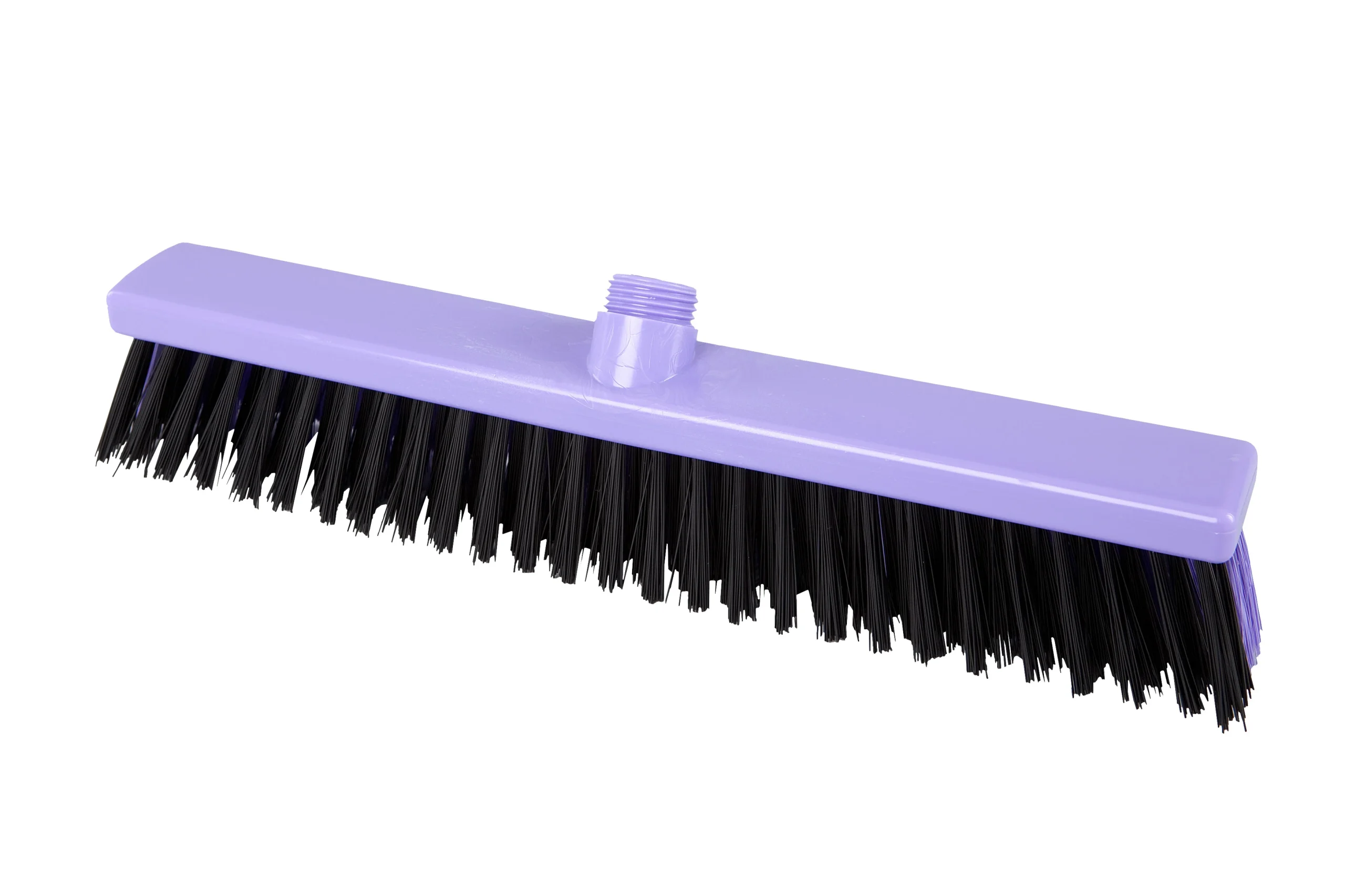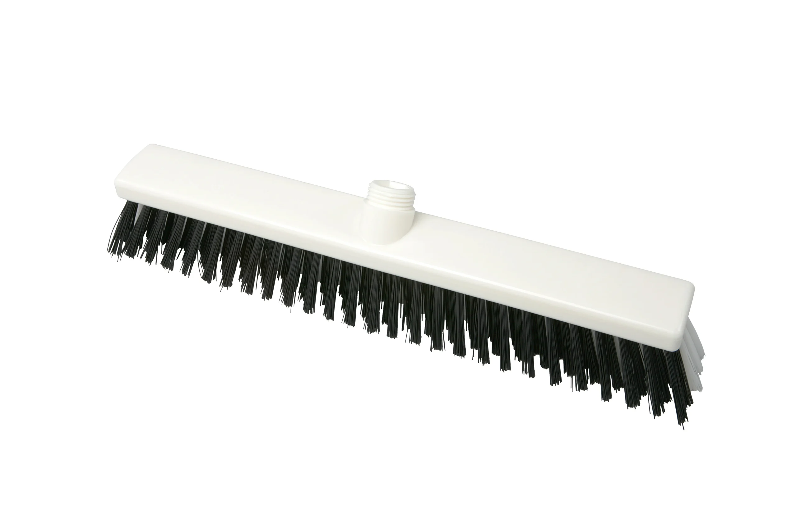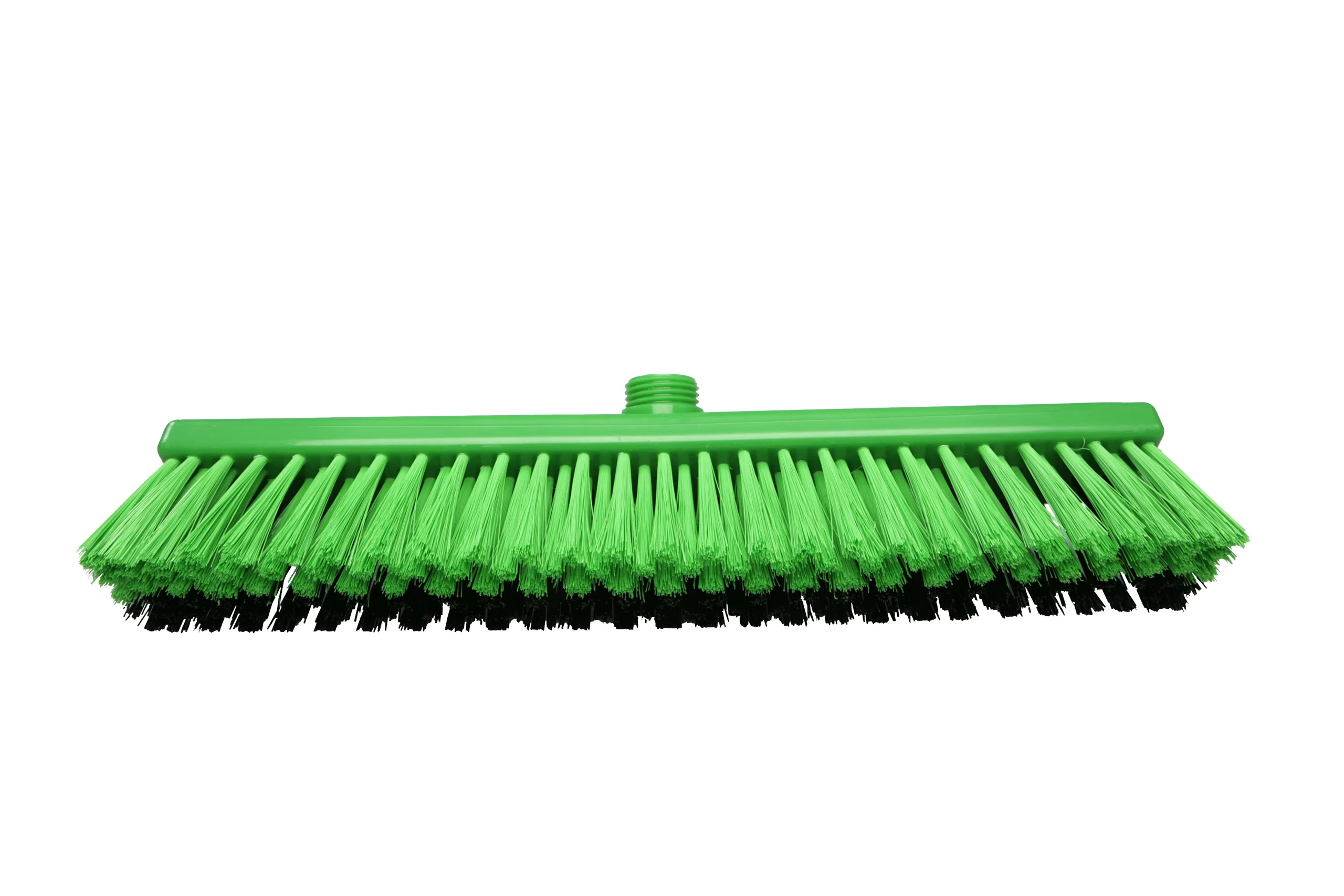 Escobillones combinados fabricados en polipropileno con filamentos de PBT en dos rigideces. Los filamentos frontales negros (0.70 mm) eliminan residuos incrustados, mientras que los posteriores más suaves (0.30 mm) capturan partículas finas. Ideal para una limpieza eficiente en pisos que combinan suciedad pesada con residuos livianos. Resistencia térmica de hasta 80 °C en uso y 134 °C para esterilización. Compatibles con mangos de rosca externa.