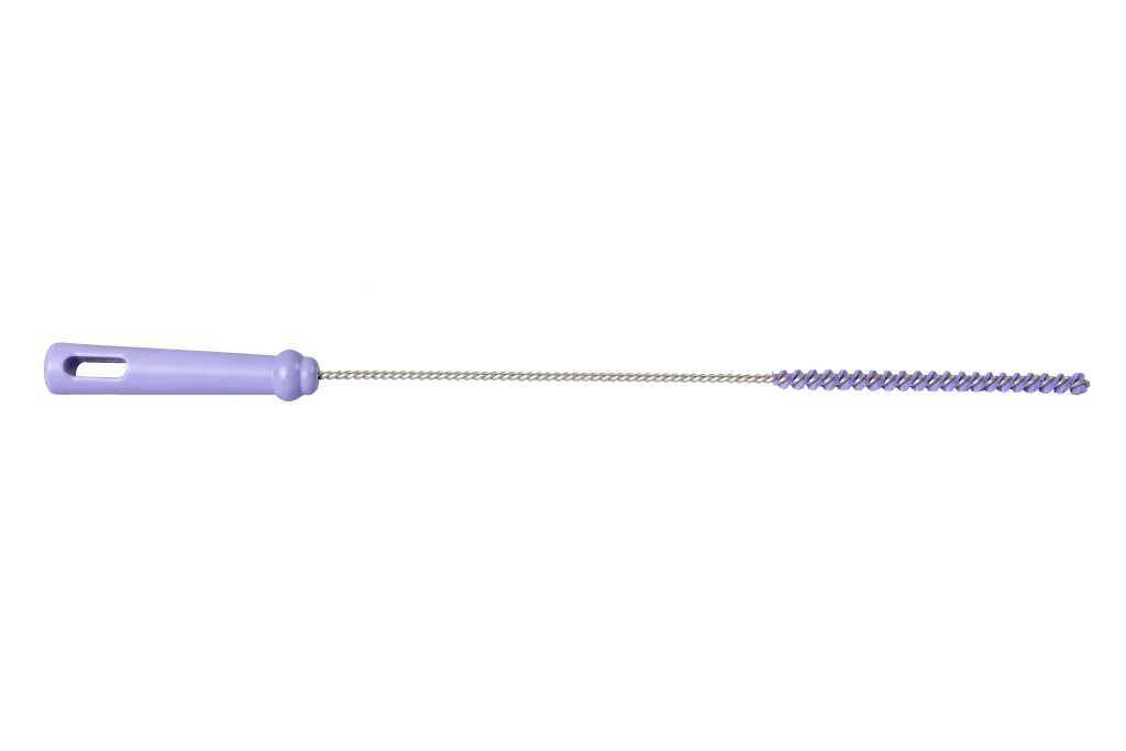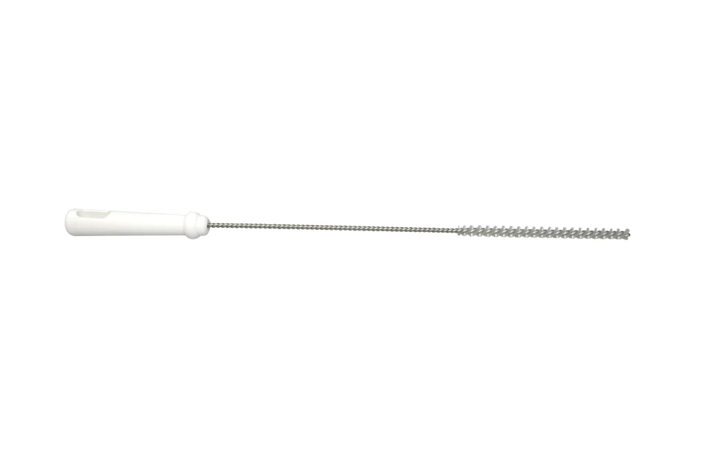 Cepillo de mano con mango largo y filamentos de poliéster PBT de dureza media, con radio de 10 mm. Ideal para limpieza detallada en tuberías pequeñas, permite acceder con facilidad para remover residuos y mantener la higiene en espacios estrechos y exigentes.