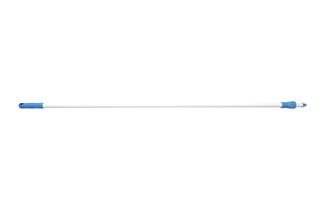 Mango de fibra de vidrio de 1750 mm, liviano y de alta resistencia. Incluye empuñadura azul y conexión de rosca externa para accesorios de limpieza.