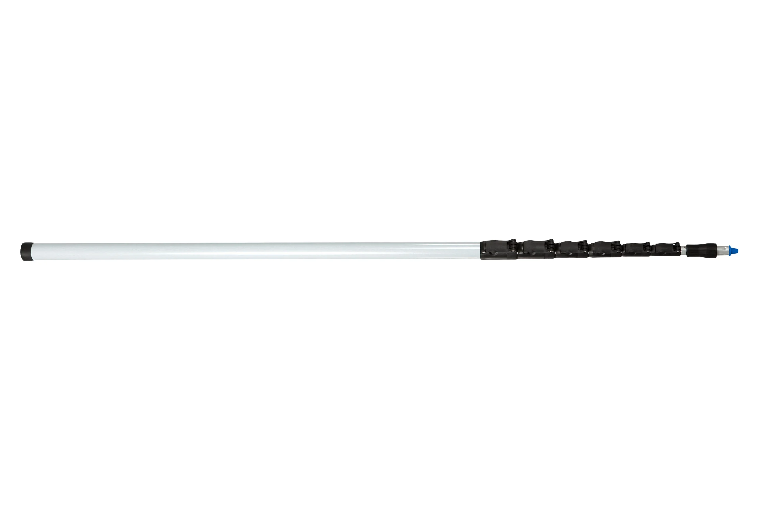 Mango de fibra de vidrio que se extiende de 1100 a 1900 mm. Es altamente resistente y ligeramente más liviano que los de aluminio, una excelente opción para limpiar zonas en altura o de difícil acceso manteniendo rigidez y control.